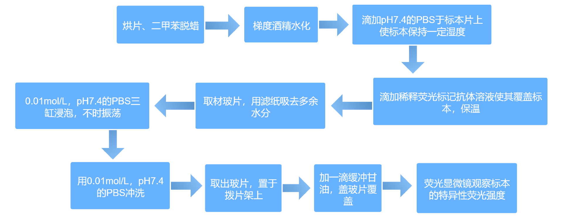 免疫学的基本反应是抗原-抗体反应。由于抗原抗体反应具有高度的特异性,所以当抗原抗体发生反应时,只要知道其中的一个因素,就可以查出另一个因素。免疫荧光技术就是将不影响抗原抗体活性的荧光色素标记在抗体(或抗原)上,与其相应的抗原(或抗体)结合后,在荧光显微镜下呈现一种特异性荧光反应。